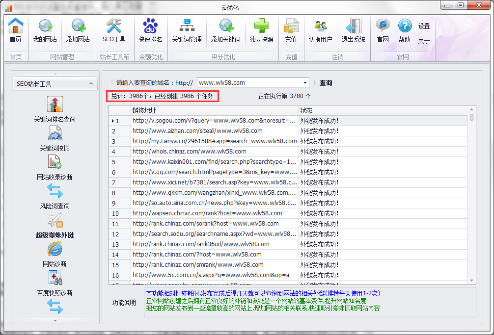 了解seo的朋友都知道,在对网站进行优化的时候单单对站内进行优化还是远远不够的,我们在优化的时候还要为网站进行发布外链,外链的作用能够有效地提升网站的流量及权重,只有网站流量得到有效提升我们的网站关键词才能够快速的提升。我们通过我们自己的云优化软件来为您网站进行外链发布(云优化软件下载地址:http://www.soupv.com/),将网站首页链接发布到各大论坛博客,提升我们网站入口,达到流量提升的作用。(如图)